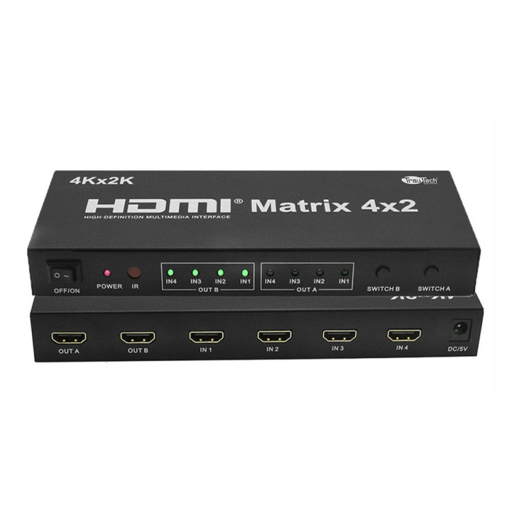 El Matrix HDMI 4×2 puede conectar 4 fuentes de señal HD a 2 terminales de pantalla UHD. La matriz permite cambiar o dividir cuatro dispositivos HDMI fácilmente a dos monitores o proyectores compatibles con HDMI.